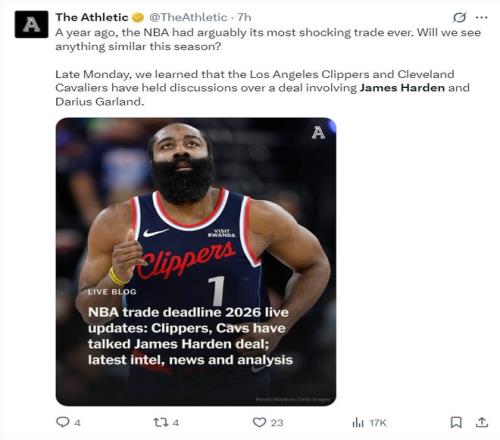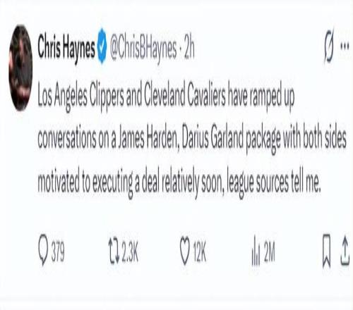 根據(jù)NBA記者克里斯-海恩斯的報道,快船、騎士兩隊的溝通正在加速,哈登換加蘭的談判有條不紊的進行,雙方都希望能促成這筆交易。