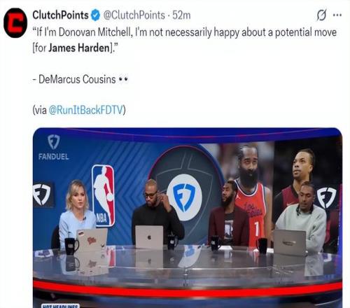 在最新的FDTV節(jié)目中,前NBA球員考辛斯談到騎士、快船關(guān)于哈登、加蘭的交易,他說道:如果我是多諾萬-米切爾,我會很高興球隊可以交易來詹姆斯-哈登。