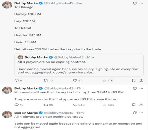 薪資結(jié)構(gòu)專家鮑比-馬克斯分析了這筆三方交易:艾維、赫爾特、康利、薩里奇都是到期合同,薩里奇再一次被交易了,他的合同是特殊條款不會(huì)進(jìn)入?yún)R總的薪酬當(dāng)中。