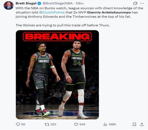 隨后NBA記者Brett Siegel報(bào)道,揚(yáng)尼斯把加盟森林狼搭檔愛(ài)德華茲視為自己的首選,森林狼也正在努力推動(dòng)揚(yáng)尼斯的交易。