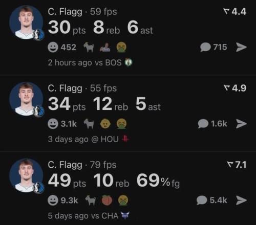 最近三場比賽,弗拉格分別砍下49分10籃板3助攻1蓋帽、34分12籃板5助攻1蓋帽、36分9籃板6助攻2蓋帽。場均39.7分10.3籃板4.7助攻1.3蓋帽,投籃命中率57.7%,三分命中率46.2%,罰球命中率85.2%。徹底把新秀墻撞破了!