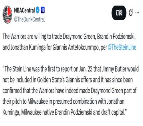 Stein表示:“1月23日我們已率先報道,吉米-巴特勒不會被納入勇士隊追逐字母哥的交易報價中。此后消息得到證實,勇士隊為說服雄鹿交易,已明確將德雷蒙德-格林納入交易方案,這份報價大概率還包含喬納森-庫明加、土生土長的威斯康星州密爾沃基人波杰姆斯基,以及若干選秀資產?!?/p>