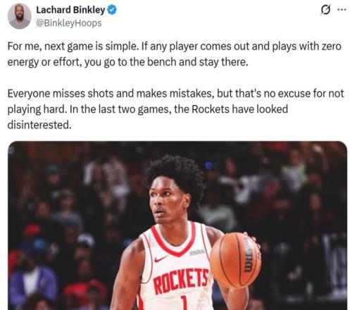 賽后火箭隨隊記者Lachard Binkley也不禁吐槽道:“投籃失準(zhǔn)和失誤都可以接受,但絕沒有不努力的理由,下一場的要求就是有球員上場后毫無能量、毫無拼勁,那就直接坐冷板凳?!?/p>