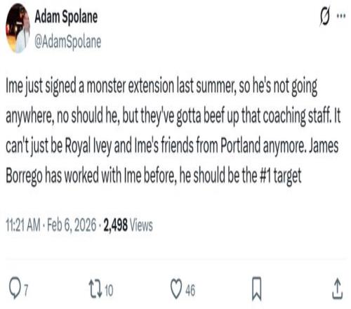 賽后火箭記者Adam Spolane對此點評道:“烏度卡去年才與火箭簽下巨額長約,所以他哪也不會去,但他必須補強助教團(tuán)隊,不能只是靠艾維和烏度卡從波特蘭帶來的那幫朋友了,博雷戈曾與烏度卡共事過,他應(yīng)該是頭號目標(biāo)人選?!?/p>