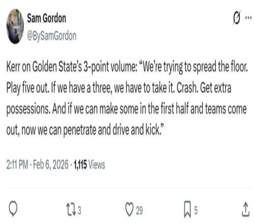 而勇士隊之所以能夠拿下勝利,主帥科爾的變陣與用人成為關鍵,半場瘋狂出手37記三分創造NBA歷史紀錄,半場在籃下0-3英尺僅出手5次,只造成了一次投籃犯規,可謂是將對于三分投射的依賴發揮到了極致。
