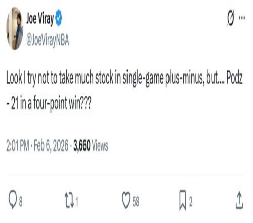 面對波杰這樣的表現,勇士記者Joe Viray賽后都不禁吐槽道:“我一般不在意正負值,但波杰在球隊贏了4分的情況下,正負值竟然為-21?”