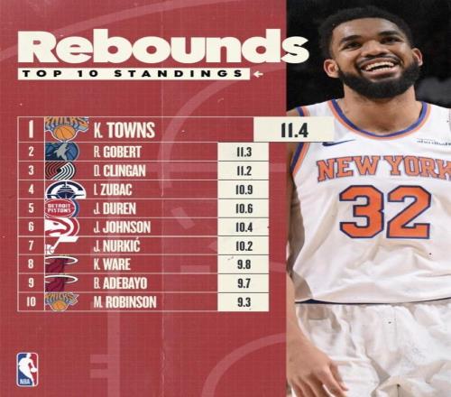 紐約:唐斯第1(11.4) + 米切爾·羅賓遜第10(9.3),說明他們的籃板產量不是靠某一位“獨扛”,而是雙點并行。