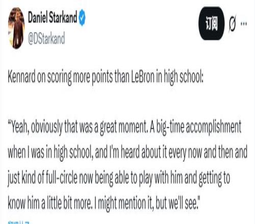 有美媒報(bào)道,肯納德高中生涯得到2977分,甚至高于詹姆斯的高中生涯(2657分)。談及高中時(shí)期得分比詹姆斯多,肯納德表示:“當(dāng)然,那是段超棒的回憶,也是我高中時(shí)的一大成就。直到現(xiàn)在偶爾還會(huì)有人提起這事,如今能和他并肩作戰(zhàn)、慢慢更了解他,感覺(jué)一切都很圓滿。我或許會(huì)跟他提提這事,不過(guò)看情況吧。”