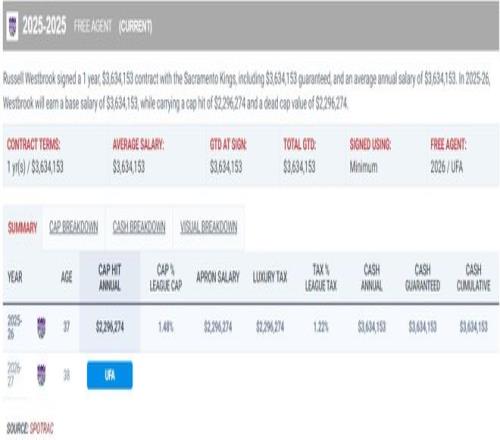 很難想象這支國(guó)王隊(duì)唯一能讓球迷駐足的球員會(huì)是37歲的威少,這是一個(gè)已經(jīng)拿了4年低廉薪水的老將,2022年784萬(wàn)、2023年383萬(wàn)、2024年560萬(wàn)、2025年330萬(wàn)、2026年363萬(wàn)。
