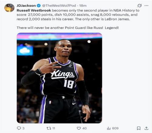 根據(jù)美記JD-杰克遜的報(bào)道,威少成為NBA歷史上唯二能達(dá)成:27000分+10000助攻+8000籃板+2000搶斷的球員,另一位是勒布朗-詹姆斯,NBA歷史上再也不會(huì)出現(xiàn)這樣的控球后衛(wèi),他是傳奇巨星。