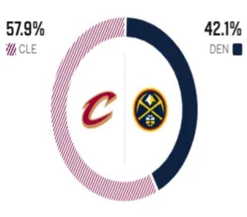 賽前,美媒ESPN對(duì)本場(chǎng)比賽進(jìn)行了預(yù)測(cè),掘金勝率僅有42.1%,騎士勝率意外高達(dá)57.9% ,占據(jù)優(yōu)勢(shì)。