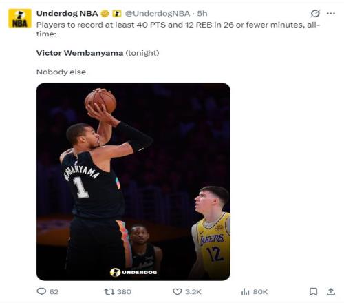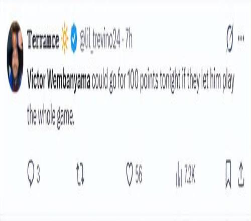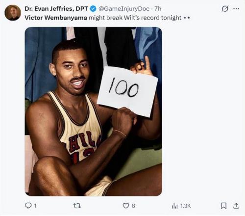美國媒體認為文班亞馬就是當代的張伯倫,而且覺得只要文班亞馬在這場比賽能打滿全場甚至可以完成張伯倫那單場100分大關的蓋世紀錄。