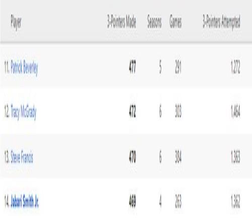 小賈巴里-史密斯三分命中數(470+)超過弗朗西斯升至隊史第13位。