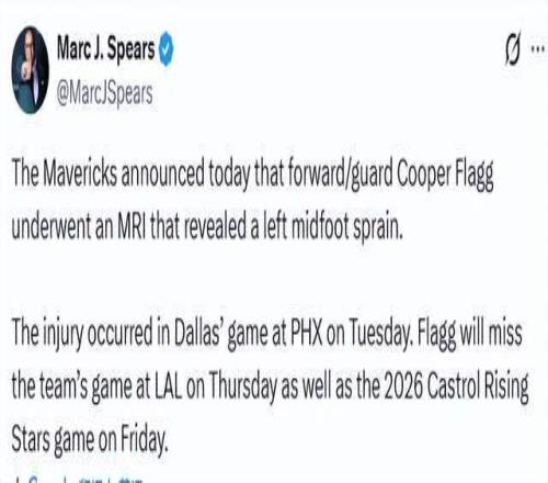 北京時間2月12日,獨行俠官方宣布,狀元弗拉格接受了核磁共振檢查,結果顯示為左腳中部扭傷。這次受傷發生在周三...