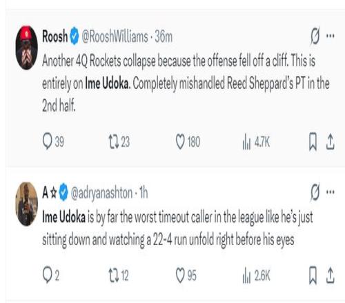 休斯頓記者:火箭又在末節輸球,原因是末節進攻嚴重下滑,這都是因為烏度卡導致的,他在末節給謝潑德的戲份太少。