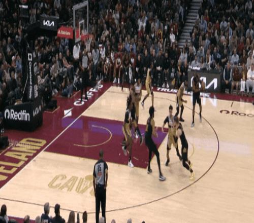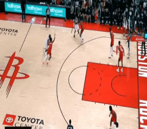 哈登和加雷特二人轉后,喂梅里爾遠射。上半場末尾,梅里爾快下接傳球,和跟進的哈登一個二人傳接,遠射。