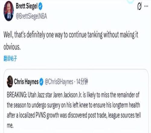 名記Haynes表示,小賈倫-杰克遜可能因此賽季報銷。Siegel轉發并寫道:“行吧,這絕對是一種不那么露骨、卻能安心擺爛的辦法。”