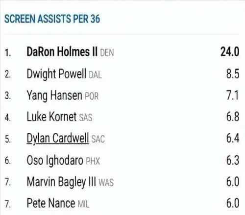 除了罰球優秀,小楊還有一項高階數據排名聯盟前三,真的讓人沒想到。根據NBA官網的統計,球員每36分鐘的掩護助攻,小楊是7.1次,排名聯盟第三!第一名是霍姆斯,第二名是鮑威爾。從小楊不多的出場時間里,我們也經常能看到,小楊的掩護質量很高,今天的比賽中,小楊就給亨德森做了一次精彩的“戈塔特掩護”,亨德森突破到籃下,小楊在油漆區掛住了貝利和辛森兩個人,直接讓亨德森上空籃了,這就是小楊在進攻端的隱形價值。