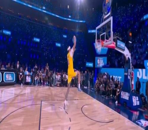 卡特-布萊恩特從右側弧頂開始啟動,拋球到籃下第一次落點不理想,隨后再次嘗試沖到籃下,騰空完成接反彈球大風車暴扣得到49.4分,兩輪比賽合計得到94.8分。