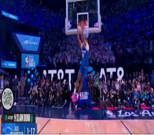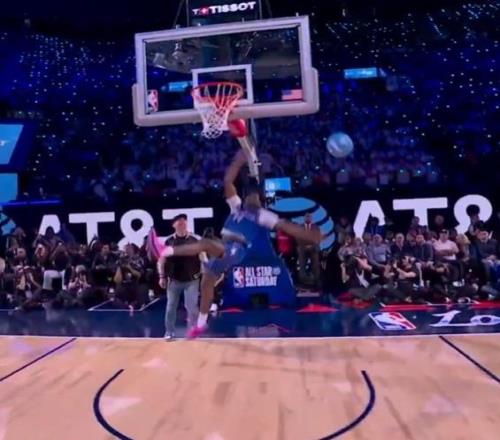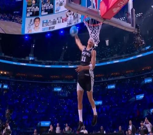 卡特-布萊恩特決賽第一扣從右側弧頂啟動,拋球到籃下加速起飛高高躍起,接反彈球完成胯下換手側身暴扣,由于難度更高獲得滿分50分,也是今年扣籃大賽首個滿分扣籃。