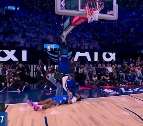 第三位登場的是熱火球員凱沙德-約翰遜,他登場先進行了一段舞蹈秀,他從右側啟動嘗試飛躍一人未能完成,隨后凱沙德-約翰遜左手摸后腦勺飛躍說唱歌手,完成暴扣完成拉桿暴扣獲得47.4分。