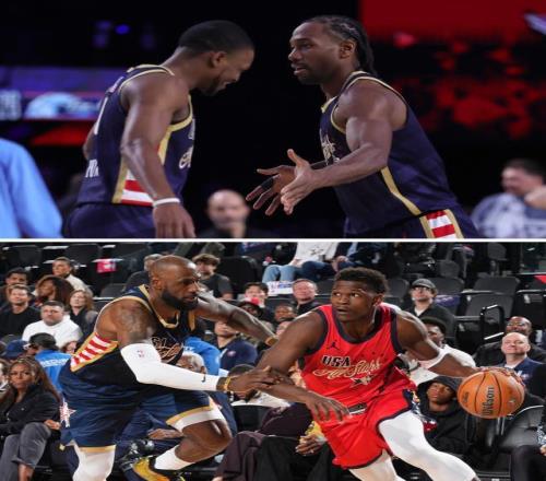 有了第一場比賽的基調,第二場的美國內戰同樣一上來就格外激烈。曾經放話美國老同志會努力應戰的杜蘭特開場就投進三分,杰倫·布朗更是火力全開頻繁沖擊,老同志組成的條紋隊一度領先到8分。