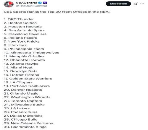 湖人隊排在第25名存在一定的爭議,因為紫金軍團的建隊策略一直都是以迎合頂級球星為主,從詹姆斯到濃眉哥,再到東契奇,湖人隊一直都能拿到頂級球員。