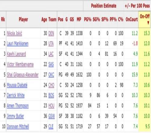 除此之外根據(jù)BXR的數(shù)據(jù),倫納德在本賽季的ON-Off(在場(chǎng)與離場(chǎng)百回合正負(fù)值的差值)11.6排在聯(lián)盟第三。