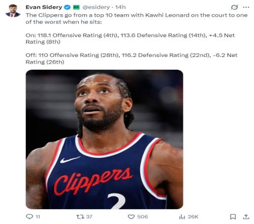 根據(jù)《福布斯體育》記者埃文-斯迪瑞最新的消息,本賽季的倫納德算是獨(dú)扛快船,卡哇伊在場(chǎng)時(shí)快船進(jìn)攻效率118.1(聯(lián)盟第四),不在場(chǎng)時(shí)進(jìn)攻效率110(聯(lián)盟28)。