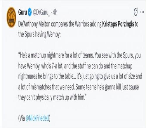 梅爾頓談到新援珀金:波爾津吉斯是很多球隊的對位噩夢,正如馬刺隊的文班亞馬一般,這兩人都是7尺多的身高,兼具尺寸與投射,我們會有大量的錯位優勢,聯盟很多球隊根本防不住他,這就是純粹的身體天賦碾壓。