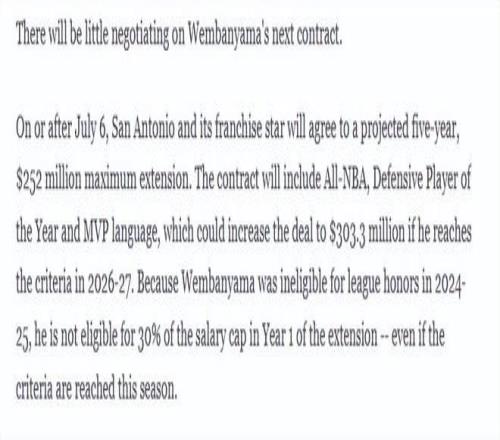 由于文班亞馬在2024-25賽季沒有資格參評(píng)聯(lián)盟獎(jiǎng)項(xiàng),即便本賽季達(dá)標(biāo),他續(xù)約第一年的薪資也無法占到工資帽的30%。