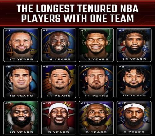 這份榜單的統計口徑,實際是“現役球員在當前效力球隊的在隊年限”,所以它天然更偏向那種“早早進隊、一直沒走、球隊也長期圍繞他建隊”的人。庫里17年、格林14年、阿德托昆博13年、恩比德12年、約基奇11年、布克11年,都是這種“長期綁定”的典型。反過來,像哈登這種哪怕曾經在火箭待了很久,只要現在不在火箭,那段年限就不會出現在這張榜單里——這也是很多人第一眼容易誤會的地方。