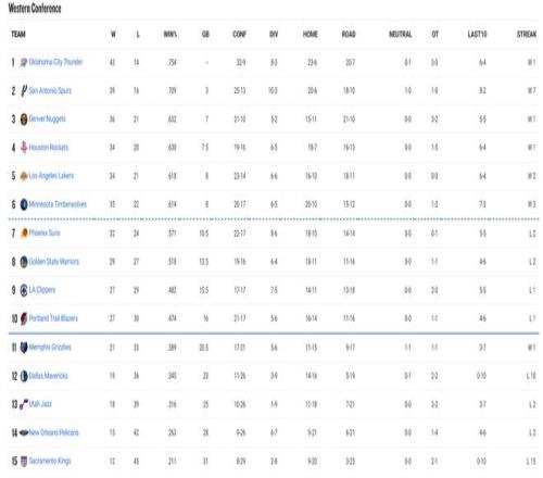 北京時間2月21日的常規(guī)賽打完后,西部的格局又發(fā)生了一些變化,雷霆大勝籃網(wǎng)但還是丟掉了聯(lián)盟第一,因為勝率已經(jīng)不如活塞;快船逆轉(zhuǎn)湖人失敗但開拓者慘敗掘金,快船還是穩(wěn)住了西部第九的席位。湖人與森林狼沒有勝場差,湖人是艱難壓制森林狼。