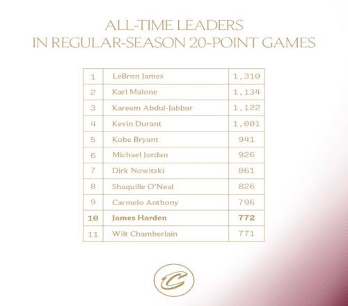 這場(chǎng)比賽哈登迎來(lái)里程碑,他完成772次20+升至歷史第10,排在他身前的安東尼是796場(chǎng)。