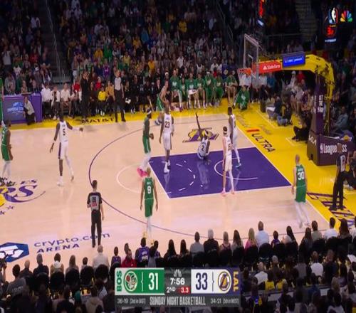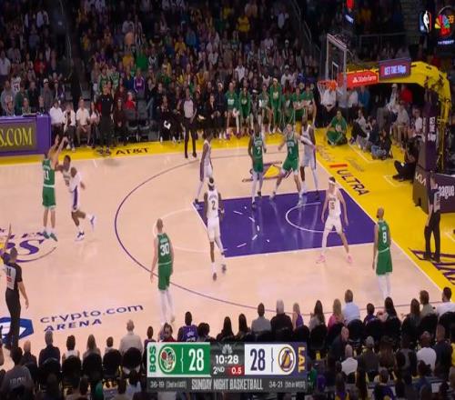 第四節剩下3分鐘的一球,凱爾特人102-83領先湖人19分,勝負懸念已經不大,普里查德45度對上里夫斯,全隊拉開,然后普里查德連續胯下銜接后撤步三分,球進同時,也把湖人主力打到了替補席。