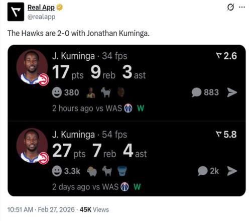 老鷹主帥斯奈德賽后談及庫明加本場的表現(xiàn)時稱贊道:“他現(xiàn)在非常專注于分享球,打得十分無私。”