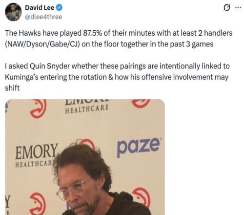 同時老鷹隊記追問本場球隊87.5%的時間中使用至少雙后衛(wèi)陣容,是否有意安排陣容以幫助庫明加快速融入體系時,斯奈德也給出肯定回答。