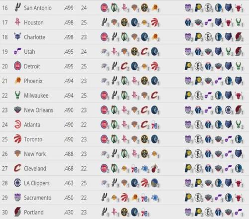 截至今天賽前,雄鹿26勝31負排名東部第11,落后第10的黃蜂1個勝場,落后第9的老鷹1.5個勝場。下面這張圖是聯(lián)盟剩余賽程的難度:掘金、雷霆、森林狼、奇才和灰熊排名前五。雄鹿僅排聯(lián)盟第22,剩余賽程算是比較輕松的。