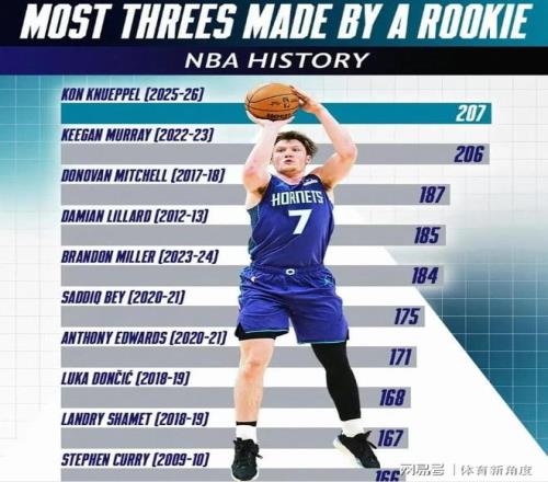 需特別指出的是,自2026年起,NBA三分球命中總數排名前三的球員中,有黃蜂隊一員。黃蜂隊的表現確實令人刮目相看!今日,克尼普爾三分球12投8中,加上這8記三分,其本賽季三分球命中總數已達209記,成功超越基根-穆雷。在命中這一記三分后,克尼普爾追平了基根-穆雷的新秀單賽季三分球紀錄(此前為206記)。而這一記三分,更使克尼普爾榮登NBA歷史新秀三分王寶座。