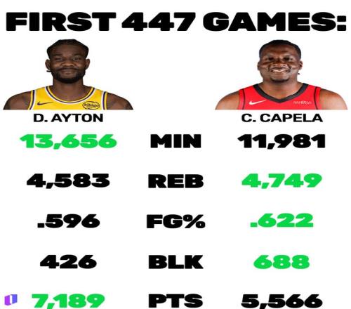 有球迷曬出了兩人生涯前447場比賽的總數據對比,艾頓上場時間(13656分鐘)和得分(7189分)高于卡佩拉,但籃板、投籃命中率和蓋帽都明顯低于對方。