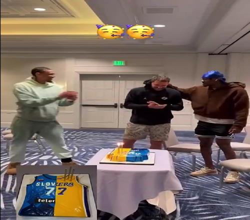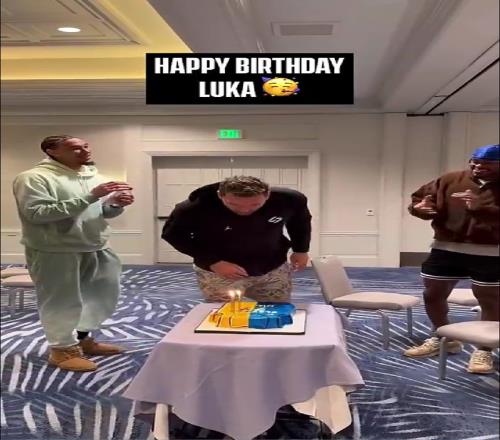 排面湖人為東契奇慶生詹皇領唱生日歌,海斯范德彪護法077吹蠟燭