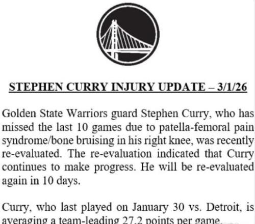勇士官宣:庫(kù)里膝傷十天后復(fù)查至少再缺席5場(chǎng)此前已缺席10場(chǎng)