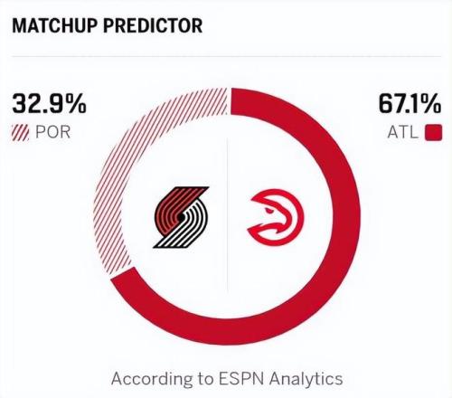 老鷹近期連勝的對手為籃網、奇才,整體實力偏弱,連勝含金量相對有限;開拓者狀態同樣起伏不定,兩隊近期表現與競技狀態差距不大。綜合來看,老鷹略占優勢,且此役是開拓者連續客場第三戰,還將面臨背靠背作戰,體能消耗較大!ESPN預測本場比賽,老鷹勝率67.1%,開拓者勝率32.9%。