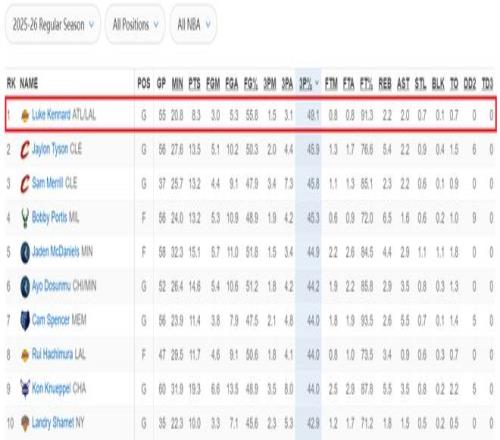 肯納德打出了投籃180俱樂部的表現——投籃命中率50%以上,三分命中率40%以上,罰球命中率90%以上。在本賽季的三分命中率榜上,肯納德高居第一。騎士隊的泰森以45.9%排名第二,梅里爾45.8%排名第三,波蒂斯以45.3%排名第四,杰登·麥克丹尼爾斯以44.9%排名第五。