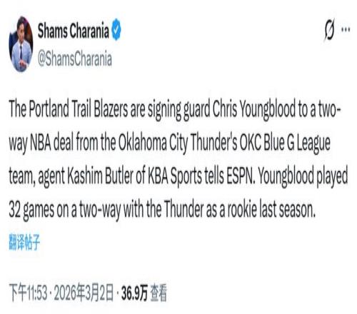 另?yè)?jù)名記Shams報(bào)道,開拓者隊(duì)與新秀后衛(wèi)克里斯-揚(yáng)布拉德達(dá)成一份雙向合同。