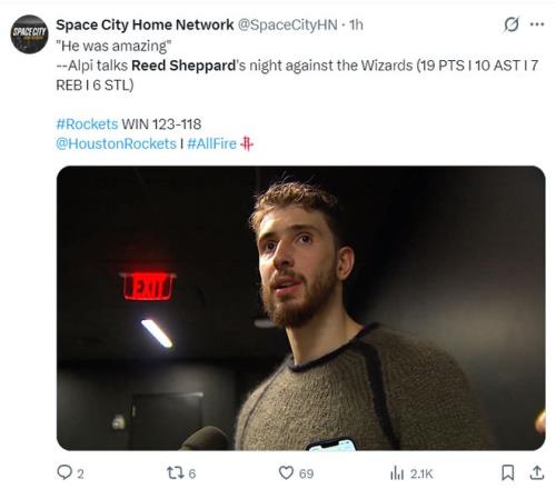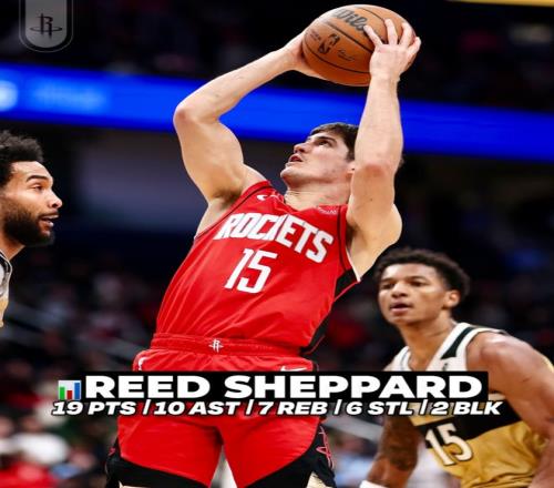 此役后謝潑德最近四場比賽,場均35.2分鐘,拿到20.3分5.3助攻4.5籃板2.5搶斷1.3蓋帽,三分命中率44.4%,他本賽季先發(fā)的9場比賽火箭7勝2負(fù)。