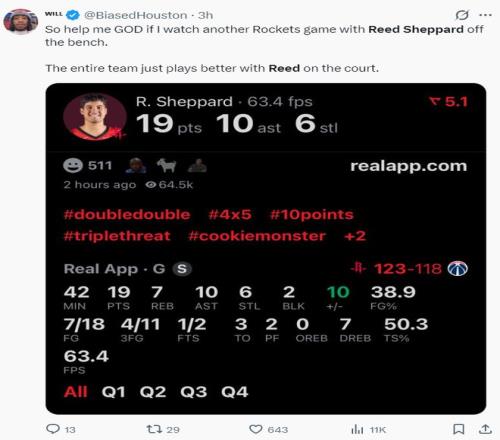 北京時間3月3日,火箭123-118擊敗奇才穩(wěn)住西部第三的席位。這場比賽杜蘭特與申京雙雙斬獲30+的數(shù)據(jù),但這兩人合計出現(xiàn)14次失誤,所以這場比賽贏球的第一亮點應(yīng)該是里德-謝潑德,他在攻防兩端的貢獻(xiàn)才是最出彩的,小賈傷停或許成為謝潑德發(fā)跡的一個轉(zhuǎn)折點。