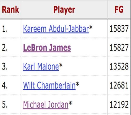常規賽生涯至今,詹姆斯已經命中15827個球,排名歷史第二,而排名第一的賈巴爾累計命中15837球,換言之,詹姆斯再進11個球就將超越天勾,成為該項數據的NBA歷史第一。