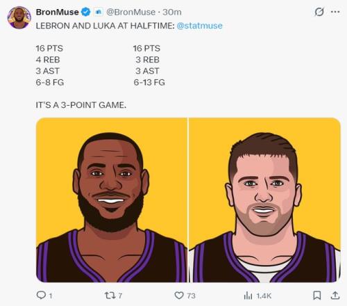 上半場打完詹姆斯8中6,三分3中1,拿到16分4籃板3助攻;東契奇半場13中6拿到16分3籃板3助攻。上半場打完湖人領(lǐng)先2分。