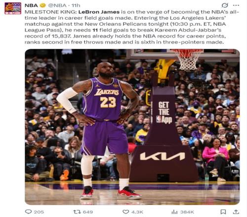 NBA官方為詹姆斯的里程碑,他還差11個(gè)運(yùn)動(dòng)戰(zhàn)進(jìn)球就打破賈巴爾15837個(gè)的紀(jì)錄,目前詹姆斯是NBA歷史總得分王,罰球命中數(shù)第二,三分命中數(shù)第六。